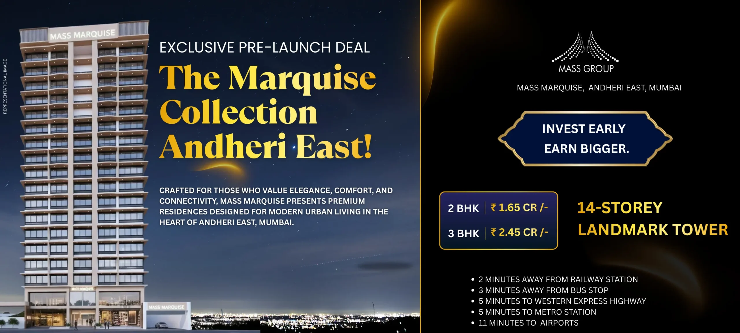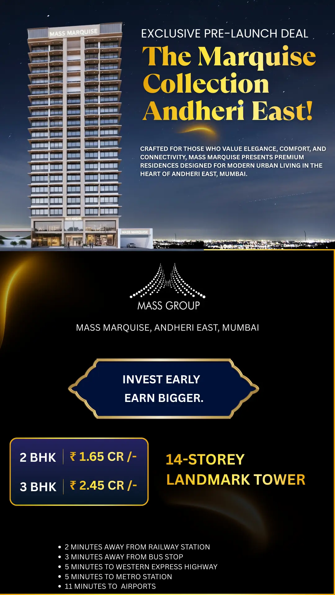 Located in the prime heart of Andheri East, Mumbai, Mass Marquise is a striking 14- storey landmark development that exemplifies contemporary elegance and functional excellence. Designed with Ground + 1 commercial spaces complemented by premium residential floors above, the project offers a seamless integration of business convenience and refined living. More than just a structure, Mass Marquise is a statement of lifestyle—crafted for those who aspire to live beyond the ordinary.